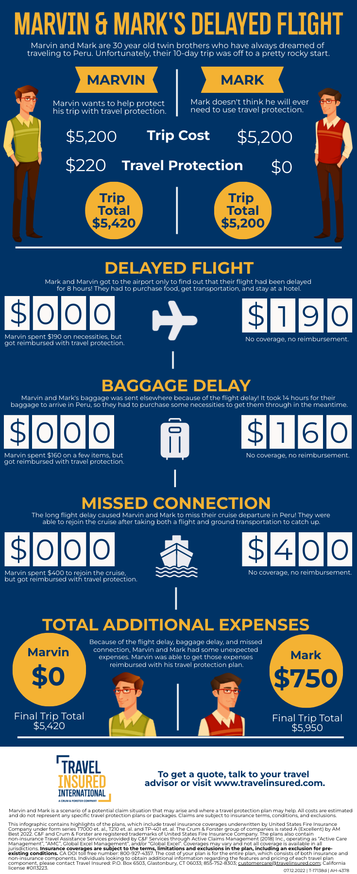 Because of the flight delay, baggage delay, and missed connection, Marvin and Mark had some unexpected expenses. Marvin was able to get those expenses reimbursed with his travel protection plan.